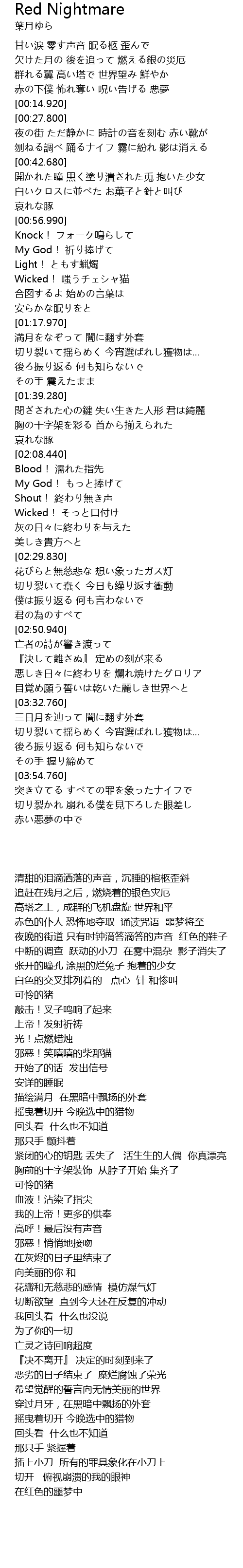 | [00:11.380] | 赤の下僕 怖れ奪い 呪い告げる 悪夢 |