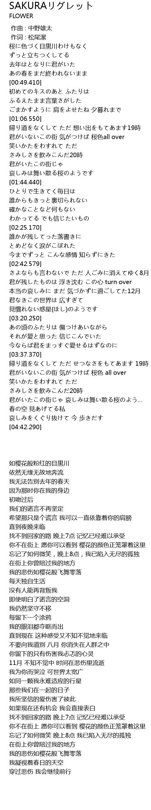 | [01:32.600] | 君がいたこの街じゃ 哀しみは舞い散る桜のようです |