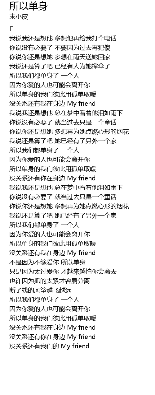 | [00:44.29] | 所以单身的我们彼此用孤单取暖 |