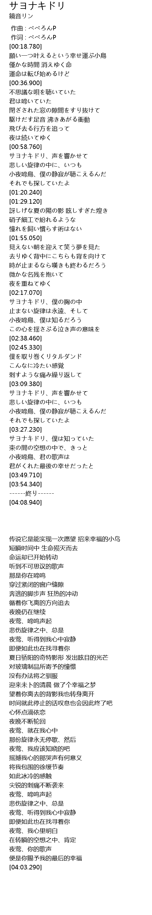 | [03:18.430] | 小夜啼鳥、僕の静寂が聴こえるんだ |