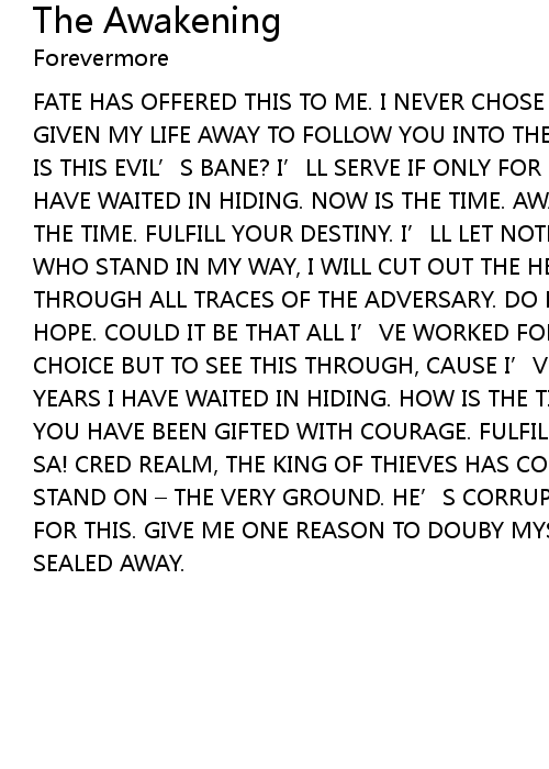 | FATE HAS OFFERED THIS TO ME. I NEVER CHOSE THIS LIFE. DESTINY CHOSE ME. I HAVE GIVEN MY LIFE AWAY TO FOLLOW YOU INTO THE DARKNESS. COULD THIS TRULY BE THE END? IS THIS EVIL' S BANE? I' LL SERVE IF ONLY FOR RIGHTEOUSNESS. SEVEN YEARS I HAVE WAITED IN HIDING. NOW IS THE TIME. AWAKEN AND FULFILL YOUR DESTINY. NOW IS THE TIME. FULFILL YOUR DESTINY. I' LL LET NOTHING STAND IN MY WAY. AND TO THOSE WHO STAND IN MY WAY, I WILL CUT OUT THE HEARTS OF THE WICKED. I WILL FIGHT THROUGH ALL TRACES OF THE ADVERSARY. DO NOT UNDERESTIMATE ME. TIME IS MY LAST HOPE. COULD IT BE THAT ALL I' VE WORKED FOR WAS FOR NAUGHT? I HAVE NO OTHER CHOICE BUT TO SEE THIS THROUGH, CAUSE I' VE BECOME TIME' S LAST HOPE. SEVEN YEARS I HAVE WAITED IN HIDING. HOW IS THE TIME. AWAKEN AND FULFILL YOUR DESTINY. YOU HAVE BEEN GIFTED WITH COURAGE. FULFILL YOUR DESTINY. LED TO THE GATES OF THE SA! CRED REALM, THE KING OF THIEVES HAS COME. HE HAS CORRUPTED THAT WHICH WE STAND ON THE VERY GROUND. HE' S CORRUPTED THE VERY GROUND. I WON' T STAND FOR THIS. GIVE ME ONE REASON TO DOUBY MYSELF. GIVE ME ONE REASON. YOU WILL BE SEALED AWAY. |