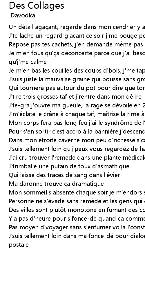| Pour s' en sortir c' est accro à la banniè re j' descend plus d' trois canettes | |