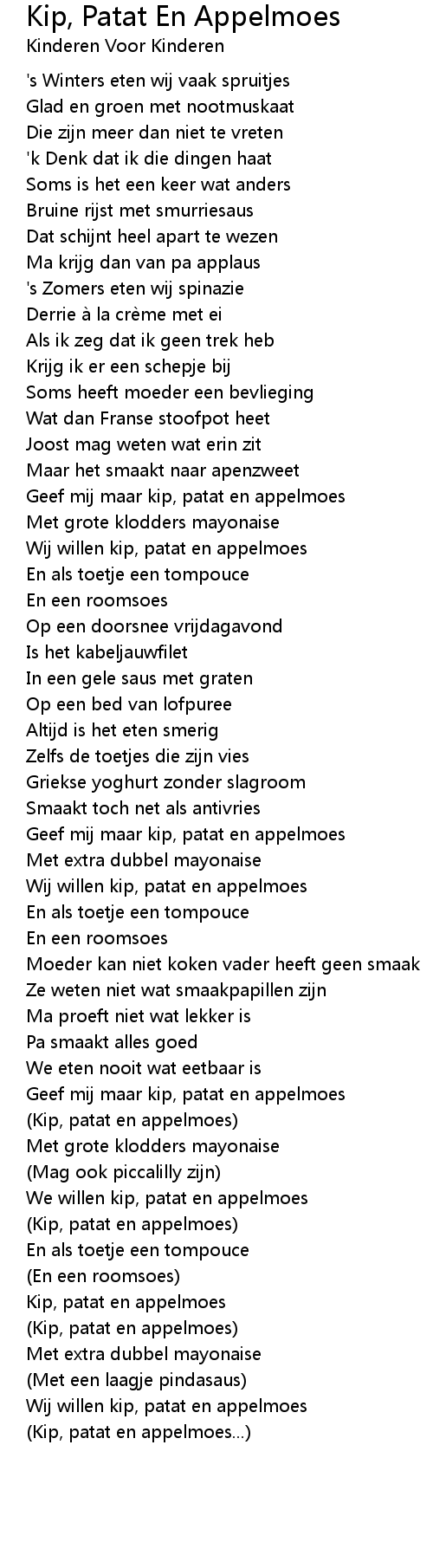 | [02:53.83] | We willen kip, patat en appelmoes |
