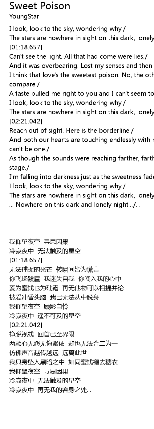 | [01:49.104] | I think that love' s the sweetest poison. No, the others can' t compare. |