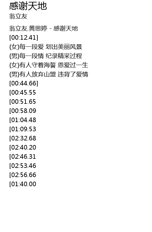 | [00:00.00] | 翁立友.黄思婷 - 感谢天地 |