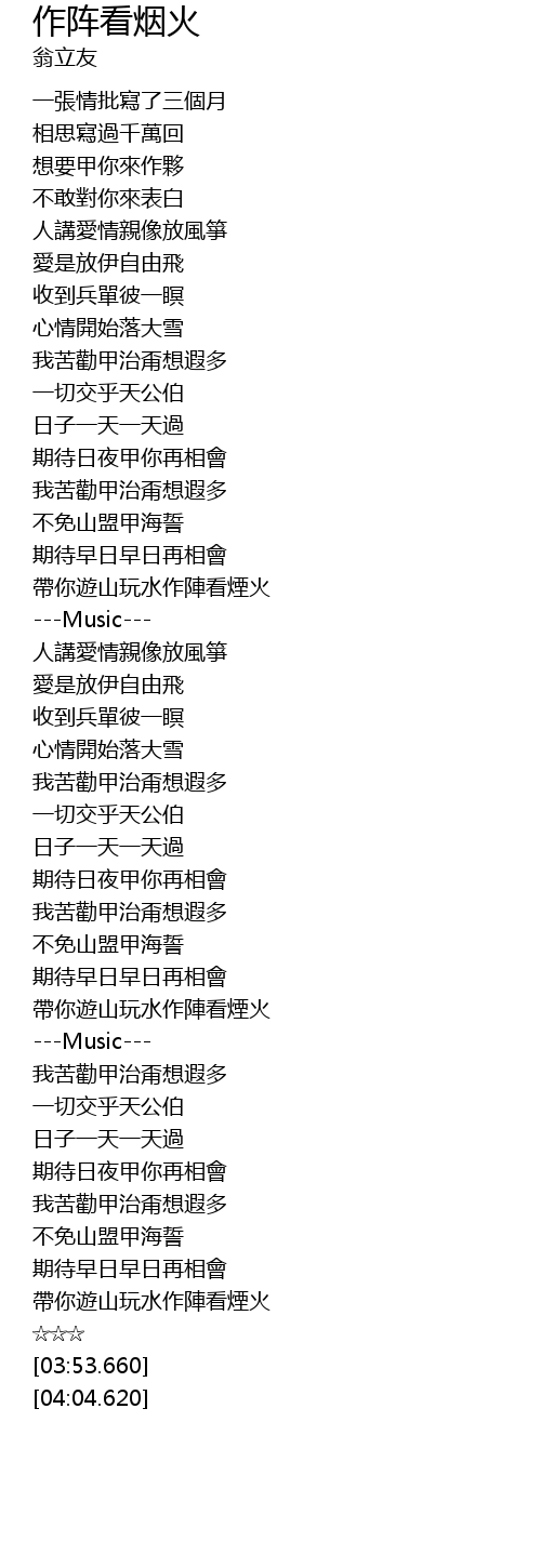 | [03:44.742] | 帶你遊山玩水作陣看煙火 |