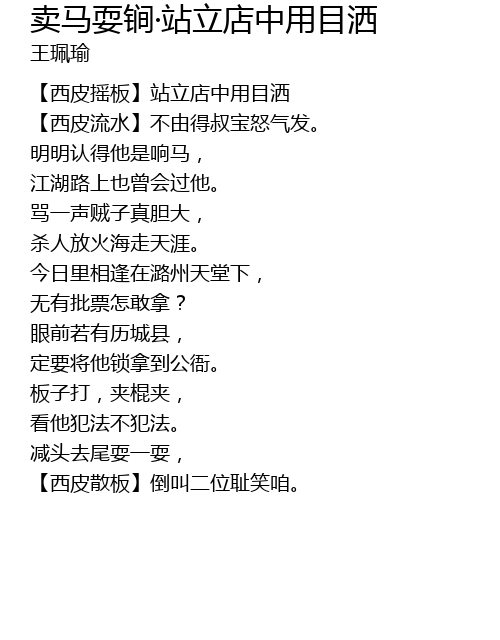 | [00:16.00] | 【西皮摇板】站立店中用目洒 |
