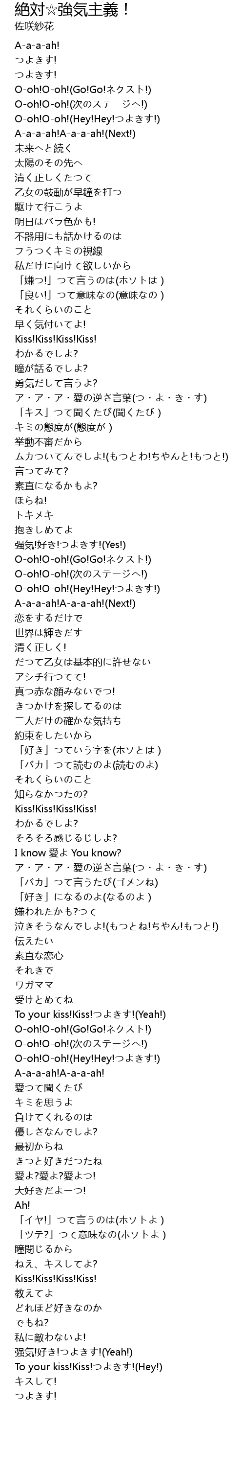 | [04:31.365] | To your kiss!Kiss!つよきす!(Hey!) |