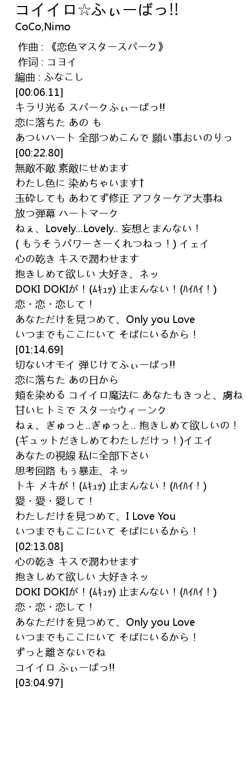 | [03:02.20] | コイイロ ふぃーばっ!! |