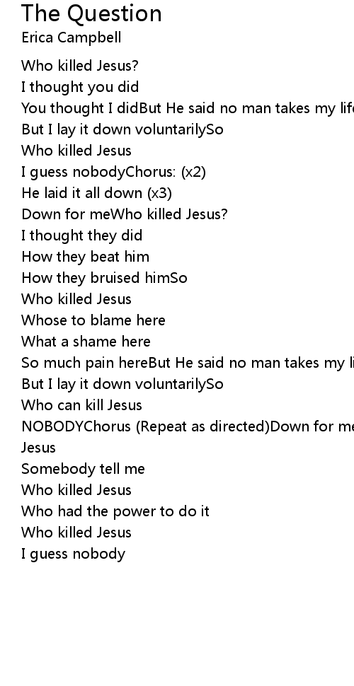 NOBODYChorus (Repeat as directed)Down for me (Repeat as directed)Who killed Jesus