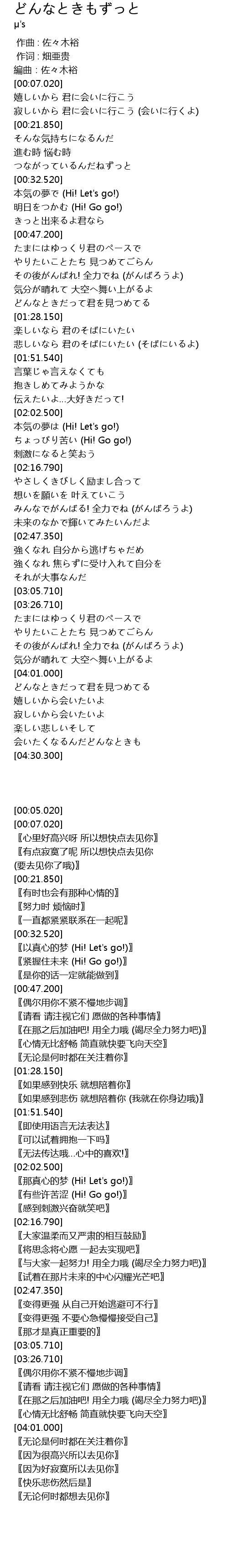 | [02:03.850] | 本気の夢は (Hi! Let's go!) |