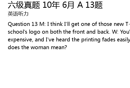 | Question 13 M: I think I'll get one of those new T-shirts, you know, with the school's logo on both the front and back. W: You'll regret it. They are expensive, and I've heard the printing fades easily when you wash them. Q: What does the woman mean? |