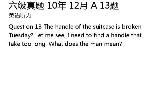 | Question 13 The handle of the suitcase is broken. Can you have it fixed by next Tuesday? Let me see, I need to find a handle that matches but that shouldn' t take too long. What does the man mean? |