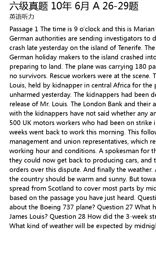 | Passage 1 The time is 9 o' clock and this is Marian Snow with the news. The German authorities are sending investigators to discover the cause of the plane crash late yesterday on the island of Tenerife. The plane, a Boeing 737, taking German holiday makers to the island crashed into a hillside as it circled while preparing to land. The plane was carrying 180 passengers. It' s thought there are no survivors. Rescue workers were at the scene. The British industrialist James Louis, held by kidnapper in central Africa for the past 8 months, was released unharmed yesterday. The kidnappers had been demanding 1 million pounds for the release of Mr. Louis. The London Bank and their agents who had been negotiating with the kidnappers have not said whether any amount of money has been paid. The 500 UK motors workers who had been on strike in High Town for the past 3 three weeks went back to work this morning. This follows successful talks between management and union representatives, which resulted in a new agreement on working hour and conditions. A spokesman for the management said they' d hope they could now get back to producing cars, and that they lost lots of money and orders over this dispute. And finally the weather. After a code start, most of the country should be warm and sunny. But towards late afternoon, rain will spread from Scotland to cover most parts by midnight. Questions 26 29 are based on the passage you have just heard. Question 26 What does the news say about the Boeing 737 plane? Question 27 What happened to British industrialist James Louis? Question 28 How did the 3week strike in High Town end? Question 29 What kind of weather will be expected by midnight in most parts of the country? |