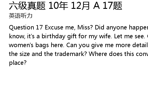 | Question 17 Excuse me, Miss? Did anyone happen to turn in a new handbag? You know, it's a birthday gift for my wife. Let me see. Oh, we've got quite a lot of women's bags here. Can you give me more detailed information, such as the color, the size and the trademark? Where does this conversation most probably take place? |