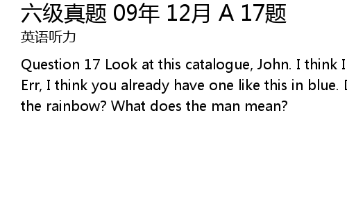Question 17 Look at this catalogue, John. I think I want to get this red blouse. Err, I think you already have one like this in blue. Do you need every color in the rainbow? What does the man mean?