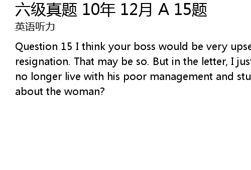 | Question 15 I think your boss would be very upset when he gets your letter of resignation. That may be so. But in the letter, I just told him frankly I could no longer live with his poor management and stupid decisions. What do we learn about the woman? |