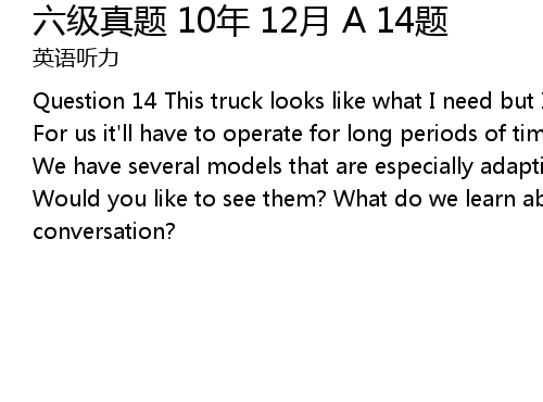 | Question 14 This truck looks like what I need but I'm worried about maintenance. For us it'll have to operate for long periods of time in very cold temperatures. We have several models that are especially adaptive for extreme conditions. Would you like to see them? What do we learn about the man from the conversation? |