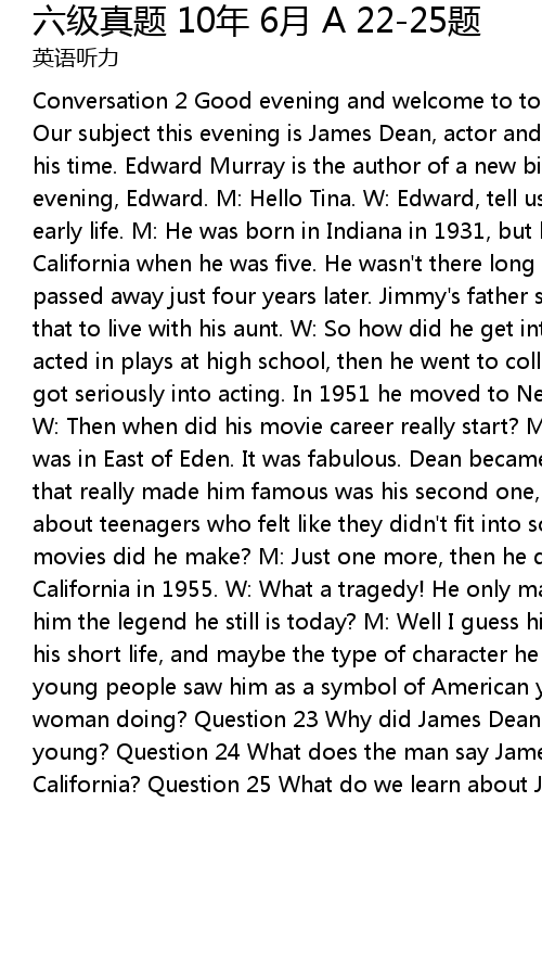 | Conversation 2 Good evening and welcome to tonight's edition of Legendary Lives. Our subject this evening is James Dean, actor and hero for the young people of his time. Edward Murray is the author of a new biography of Dean. W: Good evening, Edward. M: Hello Tina. W: Edward, tell us what you know about Dean's early life. M: He was born in Indiana in 1931, but his parents moved to California when he was five. He wasn't there long though because his mother passed away just four years later. Jimmy's father sent him back to Indiana after that to live with his aunt. W: So how did he get into acting? M: Well, first he acted in plays at high school, then he went to college in California where he got seriously into acting. In 1951 he moved to New York to do more stage acting. W: Then when did his movie career really start? M: 1955. His first starring role was in East of Eden. It was fabulous. Dean became a huge success. But the movie that really made him famous was his second one, Rebel Without a Cause, that was about teenagers who felt like they didn't fit into society. W: So how many more movies did he make? M: Just one more, then he died in that car crash in California in 1955. W: What a tragedy! He only made three movies! So what made him the legend he still is today? M: Well I guess his looks, his acting ability, his short life, and maybe the type of character he played in his movies. Many young people saw him as a symbol of American youths. Question 22 What is the woman doing? Question 23 Why did James Dean move back to Indiana when he was young? Question 24 What does the man say James Dean did at college in California? Question 25 What do we learn about James Dean from the conversation? |