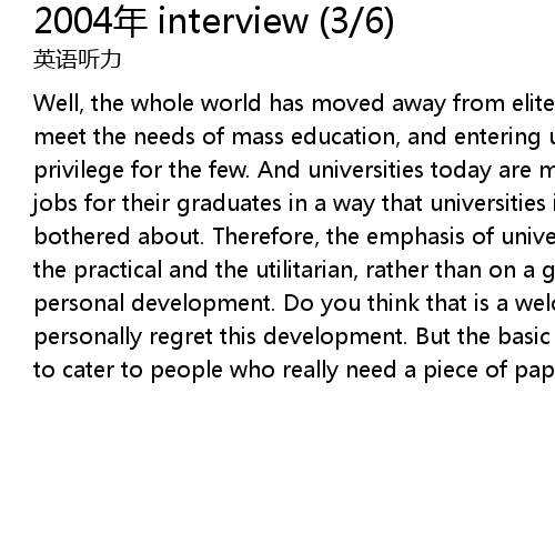 | Well, the whole world has moved away from elite education in universities to meet the needs of mass education, and entering universities is no longer a privilege for the few. And universities today are more concerned with providing jobs for their graduates in a way that universities in our time never had to be bothered about. Therefore, the emphasis of university programmes today is now on the practical and the utilitarian, rather than on a general education or on personal development. Do you think that is a welcome development? Well, I personally regret this development. But the basic bachelor's education now has to cater to people who really need a piece of paper to find a decent job. |