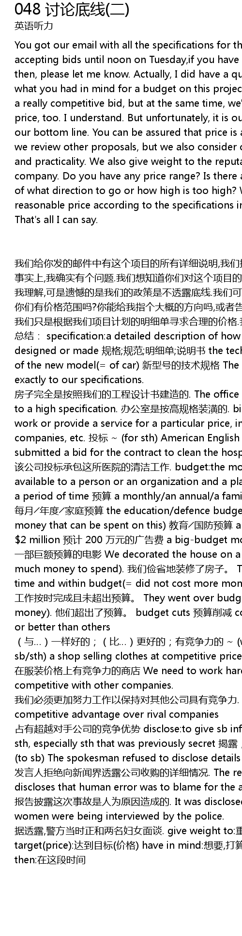 | wǒ men gěi nǐ fā de yóu jiàn zhōng yǒu zhè gè xiàng mù dì suǒ yǒu xiáng xì shuō míng, wǒ men jiē shòu tóu biāo dì shí jiān shì zhōu èr zhōng wǔ zhī qián. rú guǒ nǐ zhè duàn shí jiān yǒu shén me wèn tí de huà, qǐng gào sù wǒ... shì shí shàng, wǒ què shí yǒu gè wèn tí. wǒ men xiǎng zhī dào nǐ men duì zhè gè xiàng mù dì yù suàn shì duō shǎo. wǒ men xī wàng tí gōng yí gè zhēn zhèng yǒu jìng zhēng lì de chū jià, dàn tóng shí wǒ men yě xiǎng dá dào nǐ men de mù biāo jià wèi. wǒ lǐ jiě, kě shì yí hàn de shì wǒ men de zhèng cè shì bù tòu lòu dǐ xiàn. wǒ men kě yǐ xiàng nǐ bǎo zhèng, wǒ men zài quán héng gè gè tí àn jià gé huì shì gè hěn zhòng yào de kǎo lǜ yīn sù, dàn tóng shí wǒ men yě kǎo lǜ qí tā yīn sù, bāo kuò shè jì jí shí yòng xìng. wǒ men hái huì kǎo lǜ jìng biāo gōng sī de shēng yù. nǐ men yǒu jià gé fàn wéi ma? nǐ néng gěi wǒ zhǐ gè dà gài de fāng xiàng ma, huò zhě gào sù wǒ duō gāo shì tài gāo? wǒ men zhǐ shì gēn jù wǒ men xiàng mù jì huà de míng xì dān xún qiú hé lǐ de jià gé. wǒ néng shuō de jiù zhèi xiē. zǒng jié: specification: a detailed description of how sth is, or should be, designed or made guī gé guī fàn míng xì dān shuō míng shū the technical specifications of the new model of car xīn xíng hào de jì shù guī gé The house has been built exactly to our specifications. fáng zi wán quán shì àn zhào wǒ men de gōng chéng shè jì shū jiàn zào de. The office was furnished to a high specification. bàn gōng shì shì àn gāo guī gé zhuāng huáng de. bid: an offer to do work or provide a service for a particular price, in competition with other companies, etc. tóu biāo for sth American English on sth The company submitted a bid for the contract to clean the hospital. gāi gōng sī tóu biāo chéng bāo zhè suǒ yī yuàn de qīng jié gōng zuò. budget: the money that is available to a person or an organization and a plan of how it will be spent over a period of time yù suàn a monthly an annual a family budget měi yuè nián dù jiā tíng yù suàn the education defence budget the amount of money that can be spent on this jiào yù guó fáng yù suàn an advertising budget of 2 million yù jì 200 wàn yuán de guǎng gào fèi a bigbudget movie yī bù jù é yù suàn de diàn yǐng We decorated the house on a tight budget without much money to spend. wǒ men jiǎn shěng dì zhuāng xiū le fáng zi. The work was finished on time and within budget did not cost more money than was planned. gōng zuò àn shí wán chéng qiě wèi chāo chū yù suàn. They went over budget spent too much money. tā men chāo chū le yù suàn. budget cuts yù suàn xuē jiǎn competitive: as good as or better than others yǔ yí yàng hǎo de bǐ gèng hǎo de yǒu jìng zhēng lì de with sb sth a shop selling clothes at competitive prices as low as any other shop zài fú zhuāng jià gé shàng yǒu jìng zhēng lì de shāng diàn We need to work harder to remain competitive with other companies. wǒ men bì xū gèng jiā nǔ lì gōng zuò yǐ bǎo chí duì qí tā gōng sī jù yǒu jìng zhēng lì. to gain a competitive advantage over rival companies zhàn yǒu chāo yuè duì shǒu gōng sī de jìng zhēng yōu shì disclose: to give sb information about sth, especially sth that was previously secret jiē lù tòu lù xiè lòu sth to sb The spokesman refused to disclose details of the takeover to the press. fā yán rén jù jué xiàng xīn wén jiè tòu lù gōng sī shōu gòu de xiáng xì qíng kuàng. The report discloses that human error was to blame for the accident. bào gào pī lù zhè cì shì gù shì rén wéi yuán yīn zào chéng de. It was disclosed that two women were being interviewed by the police. jù tòu lù, jǐng fāng dāng shí zhèng hé liǎng míng fù nǚ miàn tán. give weight to: zhòng shì hit the target price: dá dào mù biāo jià gé have in mind: xiǎng yào, dǎ suàn between now and then: zài zhè duàn shí jiān |