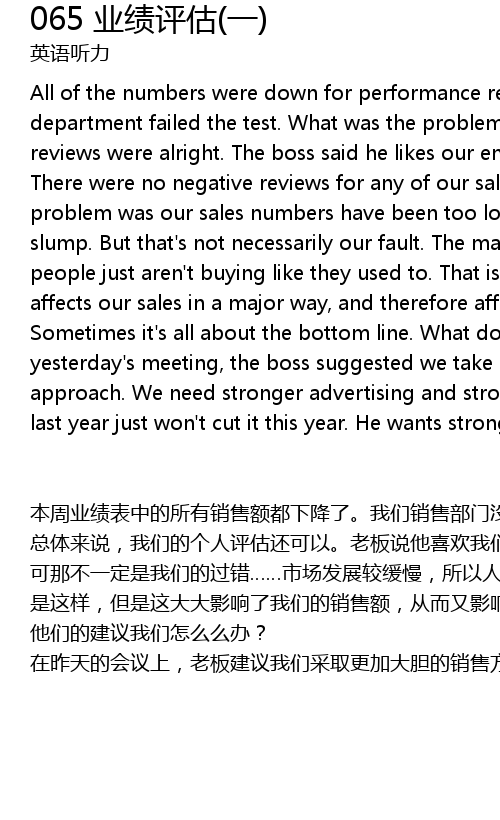 | All of the numbers were down for performance reviews this week. Our sales department failed the test. What was the problem? In general, our personal reviews were alright. The boss said he likes our enthusiasm and dedication. There were no negative reviews for any of our sales people personally, but the problem was our sales numbers have been too low for too long. We' re in a real slump. But that' s not necessarily our fault. The market' s slowed down a lot, so people just aren' t buying like they used to. That isn' t our fault. Yes, but it affects our sales in a major way, and therefore affects our performance. Sometimes it' s all about the bottom line. What do they suggest we do? In yesterday' s meeting, the boss suggested we take a more aggressive sales approach. We need stronger advertising and stronger attitude. What was fine for last year just won' t cut it this year. He wants stronger sales. | |