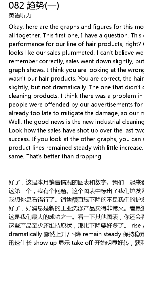 | hǎo le, zhè shì běn yuè xiāo shòu qíng kuàng de tú biǎo hé shù zì. wǒ men yì qǐ lái kàn kàn ba. zhè dì yí gè, wǒ yǒu gè wèn tí. zhè gè tú biǎo zhòng biāo chū le wǒ men hù fā xì liè chǎn pǐn de xiāo shòu qíng kuàng, duì ma? zhè tiáo xiàn huà de duì ma? hǎo xiàng wǒ men de xiāo shòu é zhí xiàn xià jiàng. wǒ bù xiāng xìn wǒ men gàn dé nà me chà. rú guǒ wǒ méi jì cuò de huà, xiāo shòu é zhǐ shì lüè wēi xià jiàng, ér bú shì xiàng tú biǎo shàng suǒ xiǎn shì de nà yàng míng xiǎn. wǒ xiǎng nǐ shì kàn cuò xíng le. xiāo shòu é zhí xiàn xià jiàng de bú shì wǒ men de hù fā chǎn pǐn. nǐ shuō de méi cuò, hù fā chǎn pǐn de xiāo shòu é shì yǒu xiē xià jiàng, dàn bú shì nà me míng xiǎn. běn yuè mài dé bù hǎo de shì xǐ dí chǎn pǐn. wǒ xiǎng wǒ men de xiāo shòu jì huà cún zài wèn tí. yǒu xiē rén duì wǒ men xǐ dí chǎn pǐn de guǎng gào hěn fǎn gǎn, kě shì yào jiǎn qīng sǔn hài yǐ jīng yǒu diǎn ér tài chí le, yīn cǐ wǒ men de shī wù zài xiāo shòu é shàng dé dào le yàn zhèng. hǎo le, hǎo xiāo xī shì xīn de gōng yè xǐ dí chǎn pǐn mài dé fēi cháng huǒ. kàn zuì jìn zhè liǎng zhōu de xiāo shòu é yǐ jīng zhí xiàn shàng shēng. zhè shì wǒ men zuì dà de chéng gōng zhī yī. kàn yī xià qí tā tú biǎo, nǐ hái huì kàn dào wǒ men qí tā chǎn pǐn de xiāo shòu qū xiàn dà duō bǎo chí wěn dìng, lüè yǒu zēng zhǎng. zhèi xiē chǎn pǐn zhì shǎo hái wéi chí yuán zhuàng, nà bǐ xià jiàng yāo hǎo duō le. rise decrease dramatically zhòu rán shàng shēng xià jiàng remain steady bǎo chí wěn dìng shoot up xùn sù shēng zhǎng show up xiǎn shì take off kāi shǐ míng xiǎn hǎo zhuǎn huò lì |