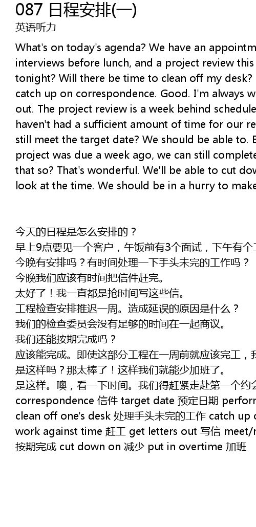 | jin tian de ri cheng shi zen me an pai de? zao shang 9 dian yao jian yi ge ke hu, wu fan qian you 3 ge mian shi, xia wu you ge gong cheng jian cha. jin wan you an pai ma? you shi jian chu li yi xia shou tou wei wan de gong zuo ma? jin wan wo men ying gai you shi jian ba xin jian gan wan. tai hao le! wo yi zhi dou shi qiang shi jian xie zhei xie xin. gong cheng jian cha an pai tui chi yi zhou. zao cheng yan wu de yuan yin shi shen me? wo men de jian cha wei yuan hui mei you zu gou de shi jian zai yi qi shang yi. wo men hai neng an qi wan cheng ma? ying gai neng wan cheng. ji shi zhe bu fen gong cheng zai yi zhou qian jiu ying gai wan gong, wo men reng neng an shi wan cheng zheng ge xiang mu. shi zhe yang ma? na tai bang le! zhe yang wo men jiu neng shao jia ban le. shi zhe yang. o, kan yi xia shi jian. wo men de gan jin zou fu di yi ge yue hui. correspondence xin jian target date yu ding ri qi performance review ye ji jian cha clean off one' s desk chu li shou tou wei wan de gong zuo catch up on gan wan, mi bu work against time gan gong get letters out xie xin meet make the deadline an qi wan cheng cut down on jian shao put in overtime jia ban |
