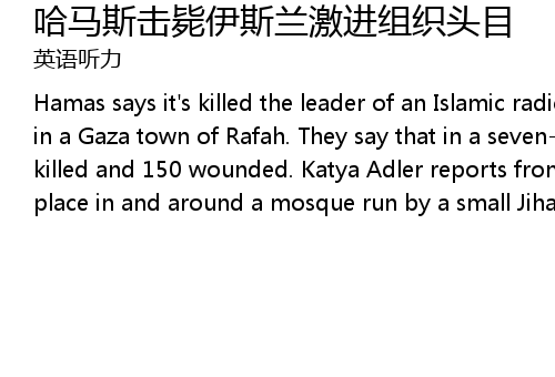 | Hamas says it' s killed the leader of an Islamic radical group AbdulLatif Moussa in a Gaza town of Rafah. They say that in a sevenhour gunbattle, 22 people were killed and 150 wounded. Katya Adler reports from Jerusalem. The fighting took place in and around a mosque run by a small Jihadi group |