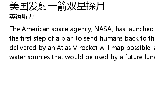 | The American space agency, NASA, has launched two unmanned probes to the moon, the first step of a plan to send humans back to the moon and beyond. The probes delivered by an Atlas V rocket will map possible landing sites and search for water sources that would be used by a future lunar colony. Part |