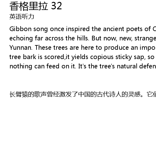 | Gibbon song once inspired the ancient poets of China, their glorious calls echoing far across the hills. But now, new, strangely quiet forests have come to Yunnan. These trees are here to produce an important and valuable crop. When the tree bark is scored, it yields copious sticky sap, so bitter and tacky that nothing can feed on it. It' s the tree' s natural defence against attack. | |