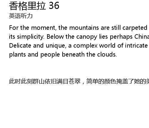 | For the moment, the mountains are still carpeted in a rich green, deceptive in its simplicity. Below the canopy lies perhaps China' s richest natural treasure. Delicate and unique, a complex world of intricate relationships between animals, plants and people beneath the clouds. | |