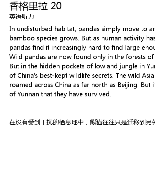 | zài méi yǒu shòu dào gān rǎo de qī xī dì zhōng, xióng māo wǎng wǎng zhǐ shì qiān yí dào lìng wài yī piàn yǒu bù tóng pǐn zhǒng zhú zi shēng zhǎng de qū yù. dàn shì rén lèi de huó dòng yǐ jīng pò huài le xióng māo shēng cún qū yù, tā men suǒ miàn lín de shēng cún huán jìng rì yì jiǒng pò. yě shēng dà xióng māo xiàn zài jǐn cún huó yú zhōng guó zhōng bù de sēn lín lǐ, yuǎn lí dōng bù. zài yǐn mì de yún nán nán bù rè dài de xiǎo xíng dī dì cóng lín lǐ, jū zhù zhe zhōng guó zuì shén mì de yě shēng dòng wù zhī yī. yà zhōu yě xiàng. yà zhōu yě xiàng zài zhōng guó de zú jī céng běi zhì běi jīng. dàn shì tā men jǐn jǐn cún huó yú yún nán de yǐn mì de shān gǔ zhī zhōng. |