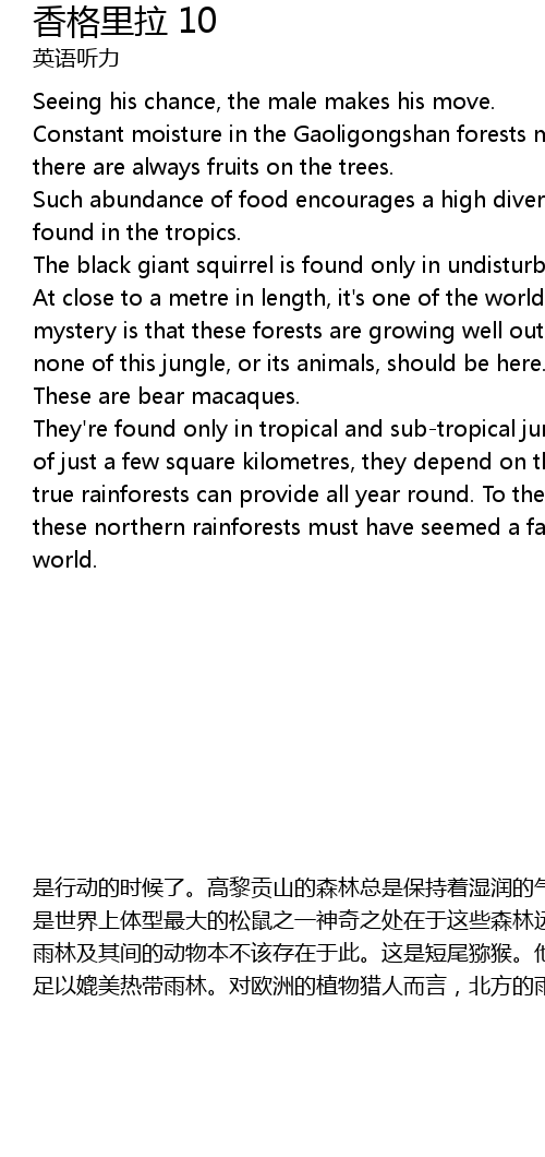 | 是行动的时候了。高黎贡山的森林总是保持着湿润的气候,这意味着这里终年都出产水果,如此丰盛的水果吸引了各式各样原本。仅存于热带地区的“水果派”们。大黑松鼠原本只生活在原始雨林中。体长近一米的大黑松鼠 是世界上体型最大的松鼠之一神奇之处在于这些森林远离热带却依旧繁茂要是公正的说 雨林及其间的动物本不该存在于此。这是短尾猕猴。他们通常只生活在热带亚热带的丛林中。之所以能够在这片方圆千米的袖珍家园生息。靠的是全年丰足的水果供给。这种得天独厚的饮食条件 足以媲美热带雨林。对欧洲的植物猎人而言,北方的雨林简直是奇幻美妙的失落世界。 |