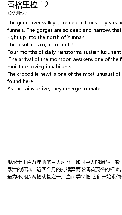 | 形成于千百万年前的巨大河谷,如同巨大的漏斗一般。这些峡谷深邃狭长,引导湿热气流径直流向滇北。然后就是降雨 暴泄的狂流!近四个月的持续雷雨滋润着茂盛的植物。季风的来临唤醒了森林中最喜好潮湿的居民。类鳄蝾螈是此处发现的 最为不凡的两栖动物之一。当雨季来临 它们开始求偶繁衍。 |