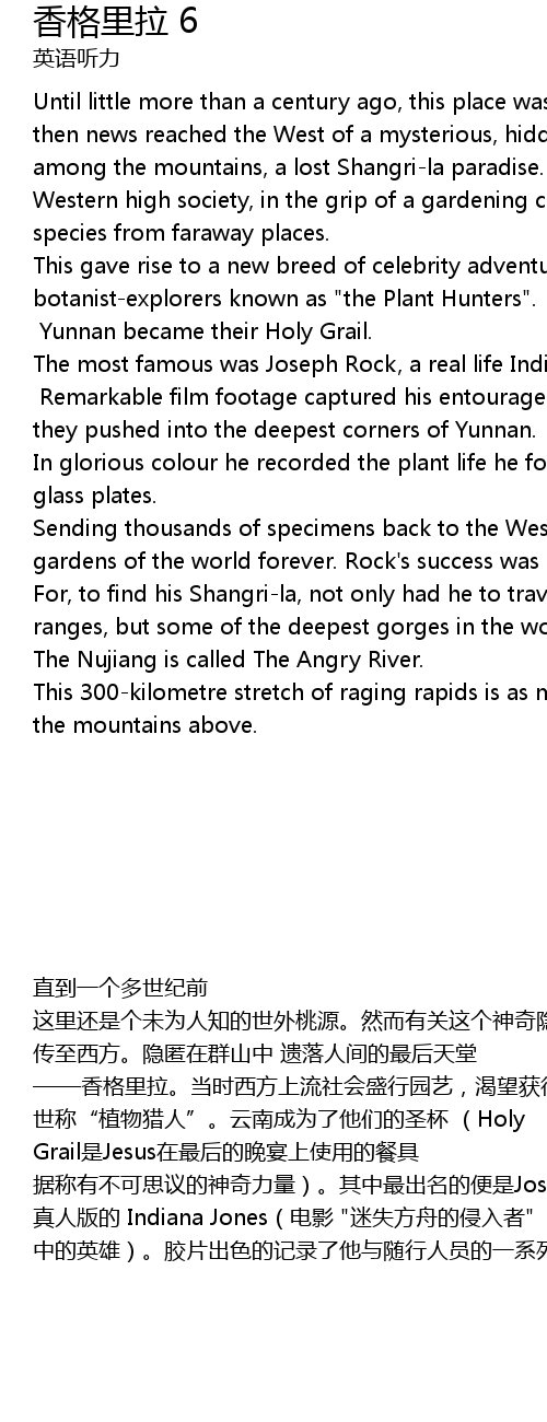 | zhí dào yí gè duō shì jì qián zhè lǐ hái shì gè wèi wéi rén zhī de shì wài táo yuán. rán ér yǒu guān zhè gè shén qí yǐn mì de dōng fāng shì jiè de chuán yán, què bù jìng ér zǒu chuán zhì xī fāng. yǐn nì zài qún shān zhōng yí luò rén jiān de zuì hòu tiān táng xiāng gé lǐ lā. dāng shí xī fāng shàng liú shè huì shèng xíng yuán yì, kě wàng huò dé yáo yuǎn guó dù de xī yǒu wù zhǒng. zhè yě zào jiù le xīn wù zhǒng de tàn xiǎn jiā, wú wèi de zhí wù tàn suǒ jiā shì chēng" zhí wù liè rén". yún nán chéng wéi le tā men de shèng bēi Holy Grail shì Jesus zài zuì hòu de wǎn yàn shàng shǐ yòng de cān jù jù chēng yǒu bù kě sī yì de shén qí lì liàng. qí zhōng zuì chū míng de biàn shì Joseph Rock zhēn rén bǎn de Indiana Jones diàn yǐng " mí shī fāng zhōu de qīn rù zhě" zhōng de yīng xióng. jiāo piàn chū sè de jì lù le tā yǔ suí háng rén yuán de yī xì liè, shēn rù yún nán fù dì de tàn xiǎn yuǎn zhēng. tā fā xiàn le qiān zī bǎi tài de zhí wù, bìng jiāng qí jì lù yú tè zhì de bō lí zhì gǎn guāng piàn shàng. tōng guò jiāng chéng qiān shàng wàn de biāo běn sòng huí xī fāng, zhí wù liè rén yǒng yuǎn de gǎi biàn le shì jiè yuán yì. Rock de chéng gōng yuán zì qí bù xiè de nǔ lì. wèi le zhǎo dào tā de xiāng gé lǐ lā, tā fān yuè liǎo wú jǐn lián mián de shān mài, zhēng fú le shì jiè shang zuì shēn de xiá gǔ. nù jiāng zhī míng yì wèi fèn nù de hé liú. mián yán sān bǎi gōng lǐ de jí liú rú tóng nèi xiē wēi é qún shān, chéng wéi le bǎo hù yě shēng shēng mìng de tiān rán píng zhàng. |