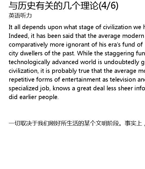 | 一切取决于我们刚好所生活的某个文明阶段。事实上,据说现代受教育的城市居民相对于过去的受教育的城市居民更加不重视他们所处的时代的知识宝库。同过去的任何一个文明国度相比较,毫无疑问在我们这个技术先进的世界有着更巨大的知识宝库,尽管如此,也存在着一个事实,即现代人和过去年代的人相比,对自己的世界的了解真是少之又少。因为他们过于依赖各种重复性的娱乐形式,比如电视,而且他们的工作范围狭隘集中。 |