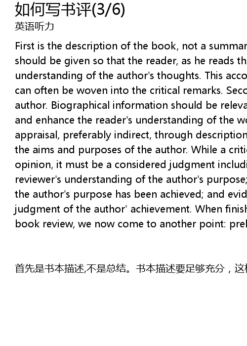 | 首先是书本描述,不是总结。书本描述要足够充分,这样,读者在阅读书评时对作者的思想能有所理解。在这方面,通常可以对书的内容目录写一些批评言论。第二,对作者的描述。传记信息应该与书评主题相关联,提高读者对著作的理解。第三,评价。最好是通过描写和阐述以及基于作者的目标和目的进行间接的评价。当这个评论是某种意见的陈述时,它必须是一个经过深思熟虑的论断,要包括评论家对作者的意图的理解的说明;评论家对作者的意图所了解的程度有多深;用以支持评论家对作者的成就的判断证据。完成书评最基本内容之后,现在我们来谈谈另一点:准备步骤。 |