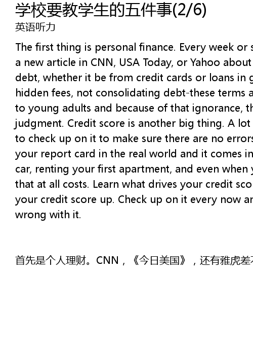 | The first thing is personal finance. Every week or so, there always seems to be a new article in CNN, USA Today, or Yahoo about young adults struggling with debt, whether it be from credit cards or loans in general. High interest rates, hidden fees, not consolidating debtthese terms and concepts are mostly unknown to young adults and because of that ignorance, they tend to make big errors in judgment. Credit score is another big thing. A lot of young adults don' t bother to check up on it to make sure there are no errors with it. Your credit score is your report card in the real world and it comes into play when you' re buying a car, renting your first apartment, and even when you' re getting a job. Protect that at all costs. Learn what drives your credit score down. Learn what drives your credit score up. Check up on it every now and then to ensure nothing is wrong with it. | |