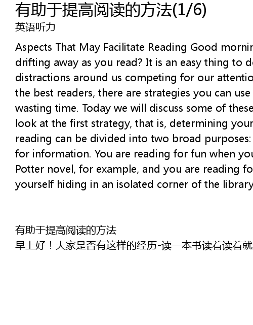 | 有助于提高阅读的方法 早上好!大家是否有这样的经历-读一本书读着读着就走神了?这种现象很正常,尤其是在我们周围有其他东西分散我们的注意力的时候。即使是最优秀的读者也不能避免在读书的时候走神,但是你可以使用一些应对策略,这样便不会浪费时间。今天我们将一起讨论其中几种应对方法。首先,我们来看下第一个策略,了解你的阅读意图。一般来说,阅读可分为两种意图:放松娱乐和获取知识。例如,你拿起一本新出的哈利波特小说,此时的阅读是为了娱乐;当你窝在图书馆不受干扰的一个角落准备考试的时候,这时读书是为了获得知识。 |