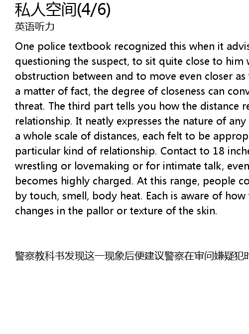 | 警察教科书发现这一现象后便建议警察在审问嫌疑犯时,坐得离他很近,不放桌子或者其他障碍物挡在两人之间,而且随着审问的进行不断逼近该嫌疑人。事实上,从亲密的程度除了发现威胁外,还可以看出其他更隐秘的信息。在第三部分,我将告诉你距离如何反映个人关系。通过距离可以看出你和你遇见的人之间的关系究竟好不好。其实一般来说,距离在美国人看来都觉得是适当的,因为它反映了某种特殊关系(这句翻译总觉得不顺。。不知道有木有好的建议嗒~)。18英寸的距离的接触为摔跤或性爱或亲密的交谈,甚至是讨论进入白热化阶段。在这个范围内,人们除了通过言语也可以通过触觉、嗅觉和体热进行交流;每一个人都知道对方的呼吸有多快,以及脸色变化和表情变化。 |
