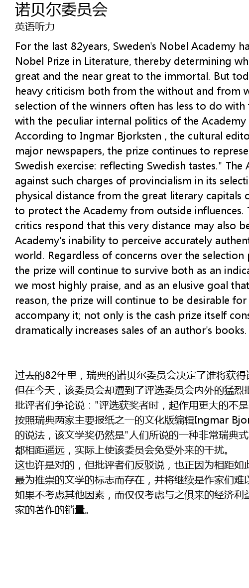| 过去的82年里,瑞典的诺贝尔委员会决定了谁将获得诺贝尔文学奖,因此也就决定了谁将从伟大或近乎伟大荣升为不朽。 但在今天,该委员会却遭到了评选委员会内外的猛烈批评。 批评者们争论说:"评选获奖者时,起作用更大的不是真实的写作能力,而是该委员会以及瑞典特有的内部政治。 按照瑞典两家主要报纸之一的文化版编辑Ingmar Bjorksten 的说法,该文学奖仍然是"人们所说的一种非常瑞典式的做为:反映瑞典口味"。对于其评选过程中目光短浅的指责,该委员会辩护说,该委员会与世界几大文学之 都相距遥远,实际上使该委员会免受外来的干扰。 这也许是对的,但批评者们反驳说,也正因为相距如此遥远,该委员会才不能准确地把握文学界的真正趋势。尽管对评选程序存在着关注,该文学奖将继续作为世人 最为推崇的文学的标志而存在,并将继续是作家们难以达到却又会不断追逐的目标。 如果不考虑其他因素,而仅仅考虑与之俱来的经济利益,该奖也将继续为人所渴求:这不仅因为该奖本身就是一笔可观的现金收入,而且该奖还将极大地增加一个作 家的著作的销量。 |