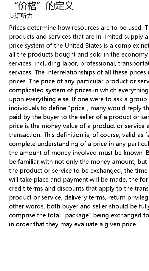 | Prices determine how resources are to be used. They are also the means by which products and services that are in limited supply are rationed among buyers. The price system of the United States is a complex network composed of the prices of all the products bought and sold in the economy as well as those of a myriad of services, including labor, professional, transportation, and public-utility services. The interrelationships of all these prices make up the "system" of prices. The price of any particular product or service is linked to a broad, complicated system of prices in which everything seems to depend more or less upon everything else. If one were to ask a group of randomly selected individuals to define "price", many would reply that price is an amount of money paid by the buyer to the seller of a product or service or, in other words, that price is the money value of a product or service as agreed upon in a market transaction. This definition is, of course, valid as far as it goes. For a complete understanding of a price in any particular transaction, much more than the amount of money involved must be known. Both the buyer and the seller should be familiar with not only the money amount, but with the amount and quality of the product or service to be exchanged, the time and place at which the exchange will take place and payment will be made, the form of money to be used, the credit terms and discounts that apply to the transaction, guarantees on the product or service, delivery terms, return privileges, and other factors. In other words, both buyer and seller should be fully aware of all the factors that comprise the total "package" being exchanged for the asked-for amount of money in order that they may evaluate a given price. |