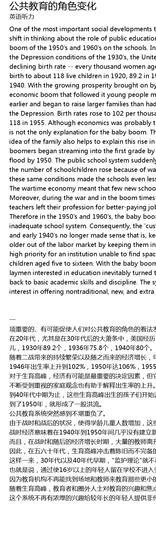 | yī xiàng zhòng yào de yǒu kě néng cù shǐ rén men duì gōng gòng jiào yù de jué sè de kàn fǎ fā shēng zhuǎn biàn de shè huì fā zhǎn shì běn shì jì wǔ liù shí nián dài de shēng yù gāo fēng duì xué xiào de yǐng xiǎng. zài 20 nián dài, yóu qí shì zài 30 nián dài hòu de dà xiāo tiáo zhōng, měi guó jīng lì le yī cì chū shēng lǜ de xià jiàng 1920 nián měi qiān míng nián líng zài 15 suì zhì 45 suì de fù nǚ shēng xià dà yuē 118 gè cún huó yīng ér, 1930 nián 89. 2 gè, 1936 nián 75. 8 gè, 1940 nián 80 gè. suí zhe èr zhàn dài lái de chí xù fán róng yǐ jí suí zhī ér lái de jīng jì zēng zhǎng, nián qīng rén bǐ dà xiāo tiáo zhōng de tóng líng rén gèng zǎo dì jié hūn chéng jiā, ér qiě bǐ qián bèi yǎng yù gèng dà de jiā tíng. 1946 nián chū shēng lǜ shàng shēng dào 102, 1950 nián dá 106, 1955 nián dá 118. duì yú shēng yù gāo fēng, jīng jì yǒu kě néng shì zuì zhòng yào de jué dìng yīn sù, dàn tā bìng bú shì wéi yī de jiě shì. bù duàn shòu dào zhòng shì de jiā tíng guān niàn yě yǒu zhù yú jiě shì chū shēng lǜ de shàng shēng. dào 40 nián dài zhōng qī wéi zhǐ, zhèi xiē shēng yù gāo fēng chū shēng de hái zi men kāi shǐ yuán yuán bù duàn dì jìn rù xiǎo xué yī nián jí. dào le 1950 nián, jiù xíng chéng le yī gǔ hóng liú. gōng gòng jiào yù xì tǒng tū rán gǎn dào bù kān zhòng fù le. yóu yú zhàn shí hé zhàn hòu de zhuàng kuàng, shǐ de xué líng ér tóng rén shù zēng jiā, zhèi xiē zhuàng kuàng shǐ de xué xiào miàn duì zhè gǔ hóng liú gèng jiā cuò shǒu bù jí. zhàn shí jīng jì yì wèi zhe zài 1940 nián dào 1950 nián jiān jī hū méi yǒu jiàn lì xīn xué xiào. ér qiě, zài zhàn shí hé suí hòu de jīng jì zēng zhǎng shí qī, dà liàng de jiào shī lí kāi gǎng wèi qù bié chù cóng shì bào chóu gèng wéi yōu hòu de gōng zuò. yīn cǐ, zài wǔ liù shí nián dài, shēng yù gāo fēng chōng jī zhe chén jiù ér bù wán bèi de xué xiào tǐ xì. zhè yàng yī lái, 30 nián dài yǐ jí 40 nián dài zǎo qī," jiān hù lǐ lùn" jiù bù zài yǒu yì yì le. yě jiù shì shuō, tōng guò shǐ 16 suì yǐ shàng de nián qīng rén liú zài xué xiào bù jìn rù láo dòng lì shì chǎng de zuò fǎ zài yě bú shì jiào yù jī gòu de yōu xiān kǎo lǜ le. yīn wèi jiào yù jī gòu bù zài néng zhǎo dào chǎng dì hé jiào shī lái jiào yù nèi xiē gèng xiǎo de 516 suì de hái zi. suí zhe shēng yù gāo fēng, jiào yù zhě hé quān wài rén shì duì jiào yù de xìng qù hé jiāo diǎn, bù kě bì miǎn dì zhuàn xiàng le gèng dī de nián jí hé jī chǔ de xué shù jì néng hé xué kē shàng. zhè gè xì tǒng bù zài yǒu nóng hòu de xìng qù gěi jiào nián zhǎng de nián qīng rén tí gōng fēi chuán tǒng de xīn shì de hé é wài de fú wù. |
