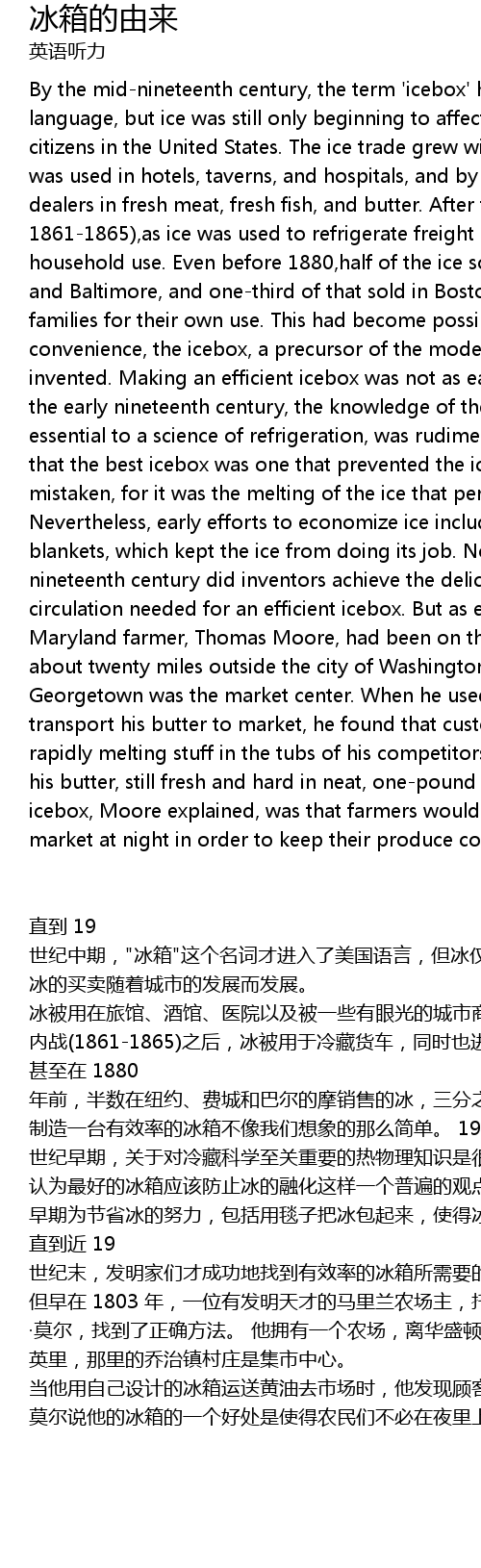 | By the mid-nineteenth century, the term 'icebox' had entered the American language, but ice was still only beginning to affect the diet of ordinary citizens in the United States. The ice trade grew with the growth of cities. Ice was used in hotels, taverns, and hospitals, and by some forward-looking city dealers in fresh meat, fresh fish, and butter. After the Civil War( 1861-1865),as ice was used to refrigerate freight cars, it also came into household use. Even before 1880,half of the ice sold in New York, Philadelphia, and Baltimore, and one-third of that sold in Boston and Chicago, went to families for their own use. This had become possible because a new household convenience, the icebox, a precursor of the modern refrigerator, had been invented. Making an efficient icebox was not as easy as we might now suppose. In the early nineteenth century, the knowledge of the physics of heat, which was essential to a science of refrigeration, was rudimentary. The commonsense notion that the best icebox was one that prevented the ice from melting was of course mistaken, for it was the melting of the ice that performed the cooling. Nevertheless, early efforts to economize ice included wrapping up the ice in blankets, which kept the ice from doing its job. Not until near the end of the nineteenth century did inventors achieve the delicate balance of insulation and circulation needed for an efficient icebox. But as early as 1803, and ingenious Maryland farmer, Thomas Moore, had been on the right track. He owned a farm about twenty miles outside the city of Washington, for which the village of Georgetown was the market center. When he used an icebox of his own design to transport his butter to market, he found that customers would pass up the rapidly melting stuff in the tubs of his competitors to pay a premium price for his butter, still fresh and hard in neat, one-pound bricks. One advantage of his icebox, Moore explained, was that farmers would no longer have to travel to market at night in order to keep their produce cool. | |
