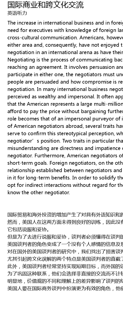 | 国际贸易和海外投资的增加产生了对具有外语知识和跨文化交流技巧的经理的需求。 然而,美国人在这两方面未得到良好的训练,因此没有在国际谈判中象他们的外国对手一样成功。谈判是为了达成协议而反复交流的过程。 它包括说服和妥协。 但是为了去进行说服和妥协,谈判者必须懂得在谈判的文化中怎样说服人和怎样达成妥协。在国外的国际商务谈判中,美国人被视为富有和不带个人情感。在外国谈判者看来,似乎美国人代表着一个庞大的拥有数百万资财的大企业,不用进一步地讨价还价就能出得起价钱。 美国谈判者的角色变成了一个没有个人感情的信息及现金的供应者。 对在国外的美国谈判者的研究中,我们找出了损害谈判者能力的几个特点,或许证实这个已成定式的看法。 尤其引起跨文化误解的两个特点是美国谈判者的直截了当和缺乏耐心。 此外,美国谈判者经常坚持实现短期目标,而外国的谈判者会珍视建立谈判者之间的联系并愿意为长期利益投入时间。 为了巩固这种联系,他们会选择非直接的交流而不计较投入用于了解对方的时间。 明显地,价值观的不同和理解上的差异影响了谈判的结果和谈判者的成功与否。 美国人要在国际商务谈判中扮演更为有效的角色,他们就必须投入更多的努力提高跨文化的理解力。 |