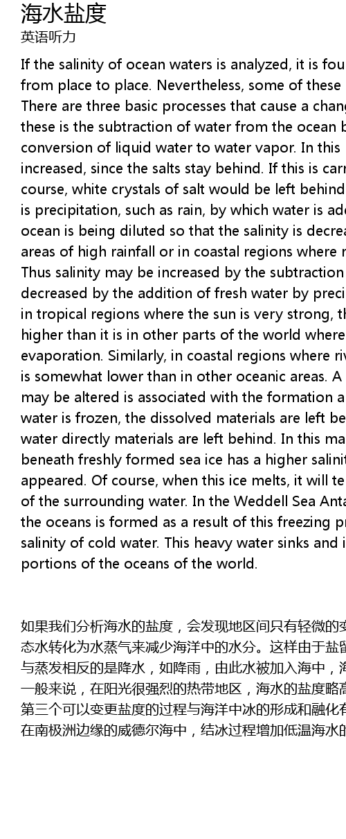 | 如果我们分析海水的盐度,会发现地区间只有轻微的变化,然而有些小的变化是重要的。导致海洋的盐度变化的基本过程有三个,其中之一是通过蒸发的方式即把液 态水转化为水蒸气来减少海洋中的水分。这样由于盐留了下来,所以盐度增大。当然,如果这种方式走向极端,将会余下白色的盐晶体。 与蒸发相反的是降水,如降雨,由此水被加入海中,海水被稀释,从而盐度降低。这种情形会发生在大量降雨的地区,或江河入海岸处。因此,盐度通过蒸发减少水分而上升或通过降水或径流增加淡水成分而下降。 一般来说,在阳光很强烈的热带地区,海水的盐度略高于世界上其它没有热带那样多的蒸发的地区。同理,在江河稀释海水的海岸地带,海水盐度略低于其它海区。 第三个可以变更盐度的过程与海洋中冰的形成和融化有关。海水冻结时,溶于其中的物质被留了下来。这样,在新形成的海水冰面的正下方的海水比在冰形成之前有更高的盐度。当然,当冰融化的时候,会降低周围水中的盐度。 在南极洲边缘的威德尔海中,结冰过程增加低温海水的盐度,从而形成了浓度最大的海水。这些大密度的海水下沉,可以在世界海洋的深水域发现。 |