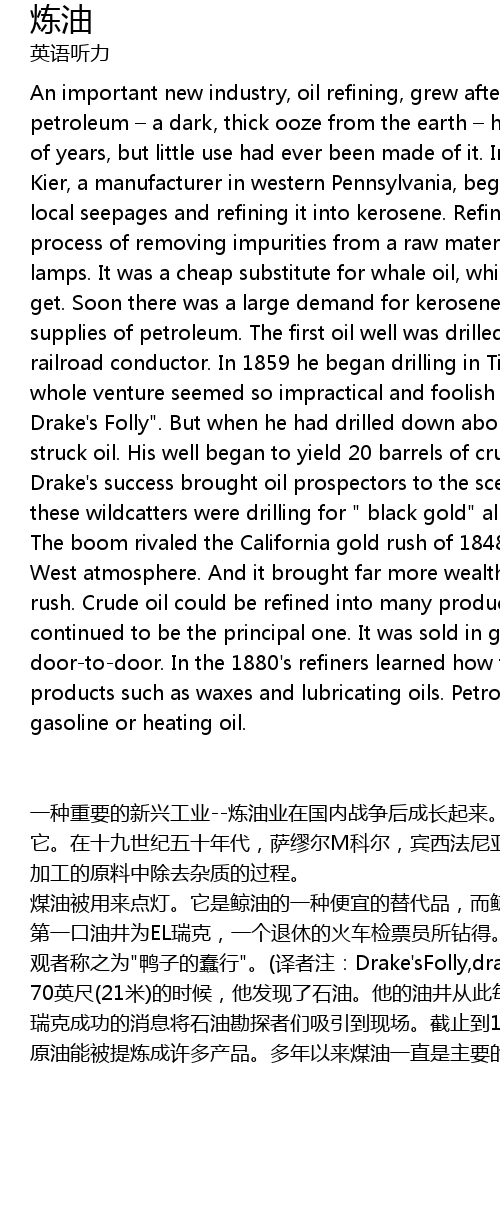 | An important new industry, oil refining, grew after the Civil war. Crude oil, or petroleum – a dark, thick ooze from the earth – had been known for hundreds of years, but little use had ever been made of it. In the 1850’s Samuel M. Kier, a manufacturer in western Pennsylvania, began collecting the oil from local seepages and refining it into kerosene. Refining, like smelting, is a process of removing impurities from a raw material. Kerosene was used to light lamps. It was a cheap substitute for whale oil, which was becoming harder to get. Soon there was a large demand for kerosene. People began to search for new supplies of petroleum. The first oil well was drilled by E.L. Drake, a retired railroad conductor. In 1859 he began drilling in Titusville, Pennsylvania. The whole venture seemed so impractical and foolish that onlookers called it " Drake's Folly". But when he had drilled down about 70 feet(21 meters), Drake struck oil. His well began to yield 20 barrels of crude oil a day. News of Drake's success brought oil prospectors to the scene. By the early 1860’s these wildcatters were drilling for " black gold" all over western Pennsylvania. The boom rivaled the California gold rush of 1848 in its excitement and Wild West atmosphere. And it brought far more wealth to the prospectors than any gold rush. Crude oil could be refined into many products. For some years kerosene continued to be the principal one. It was sold in grocery stores and door-to-door. In the 1880's refiners learned how to make other petroleum products such as waxes and lubricating oils. Petroleum was not then used to make gasoline or heating oil. | |