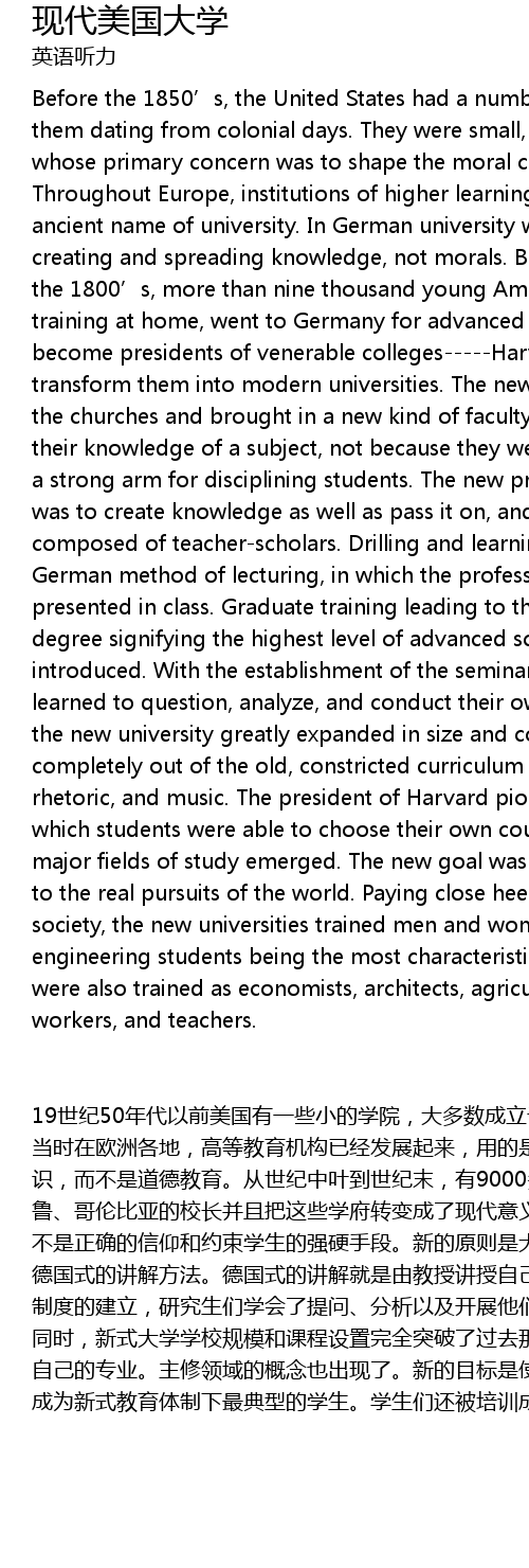 | 19 shì jì 50 nián dài yǐ qián měi guó yǒu yī xiē xiǎo de xué yuàn, dà duō shù chéng lì yú zhí mín shí qī. tā men shì yǔ jiào huì guà gōu de xiǎo jī gòu, zhǔ yào mù dì shì péi yǎng xué shēng de dào dé pǐn xíng. dāng shí zài ōu zhōu gè dì, gāo děng jiào yù jī gòu yǐ jīng fā zhǎn qǐ lái, yòng de shì yí gè gǔ lǎo de míng chēng dà xué. dé guó yǐ jīng fā zhǎn chū yī zhǒng bù tóng lèi xíng de dà xué. dé guó dà xué guān xīn de zhǔ yào shì chuàng zào zhī shí hé chuán bō zhī shí, ér bú shì dào dé jiào yù. cóng shì jì zhōng yè dào shì jì mò, yǒu 9000 duō míng měi guó qīng nián yīn bù mǎn guó nèi suǒ shòu de jiào yù ér fù dé shēn zào. tā men zhōng de yī xiē rén huí guó hòu chéng wéi yī xiē zhī míng xué fǔ hā fó yé lǔ gē lún bǐ yà de xiào zhǎng bìng qiě bǎ zhèi xiē xué fǔ zhuǎn biàn chéng le xiàn dài yì yì de dà xué. xīn xiào zhǎng men duàn jué le hé jiào huì de guān xì, pìn qǐng le xīn xíng de jiào zhí yuán, pìn yòng jiào shòu gēn jù de shì tā men zài xué kē fāng miàn dí zhī shí, ér bú shì zhèng què de xìn yǎng hé yuē shù xué shēng de qiáng yìng shǒu duàn. xīn de yuán zé shì dà xué jì yào chuán bō zhī shí yě yào chuàng zào zhī shí. zhè jiù xū yào yóu xué zhě xíng lǎo shī zǔ chéng jiào gōng duì wǔ. kào sǐ jì yìng bèi hé zuò liàn xí lái xué xí de fāng fǎ biàn wéi dé guó shì de jiǎng jiě fāng fǎ. dé guó shì de jiǎng jiě jiù shì yóu jiào shòu jiǎng shòu zì jǐ de yán jiū kè tí. tōng guò yán jiū shēng xìng zhì dì xué xí kě yǐ huò dé biǎo míng zuì gāo xué shù zào yì de gǔ lǎo de dé guó xué wèi bó shì xué wèi. suí zhe tǎo lùn kè zhì dù de jiàn lì, yán jiū shēng men xué huì le tí wèn fēn xī yǐ jí kāi zhǎn tā men zì jǐ de yán jiū. tóng shí, xīn shì dà xué xué xiào guī mó hé kè chéng shè zhì wán quán tū pò le guò qù nà zhǒng zhǐ yǒu shù xué jīng diǎn zhù zuò měi xué hé yīn yuè de xiá zhǎi kè chéng biǎo. hā fó dà xué de xiào zhǎng shuài xiān tuī chū xuǎn kè zhì dù, zhè yàng xué shēng men jiù néng xuǎn zé zì jǐ de zhuān yè. zhǔ xiū lǐng yù de gài niàn yě chū xiàn le. xīn de mù biāo shì shǐ dà xué duì shí jì shè huì gèng yǒu yòng. mì qiè guān zhù zhe shè huì shàng de shí jì xū qiú, xīn de dà xué zhuó yì péi yǎng xué shēng jiě jué wèn tí de néng lì. gōng chéng xì xué shēng chéng wéi xīn shì jiào yù tǐ zhì xià zuì diǎn xíng de xué shēng. xué shēng men hái bèi péi xùn chéng wéi jīng jì xué jiā jiàn zhù shī nóng xué jiā shè huì gōng zuò rén yuán yǐ jí jiào shī. |