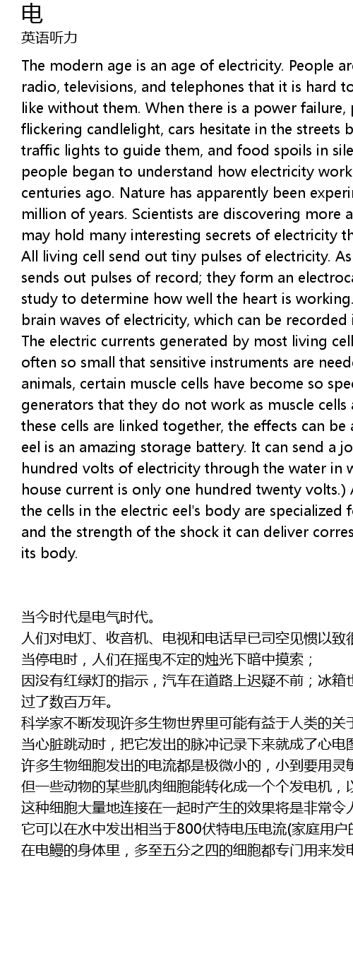 | The modern age is an age of electricity. People are so used to electric lights, radio, televisions, and telephones that it is hard to imagine what life would be like without them. When there is a power failure, people grope about in flickering candlelight, cars hesitate in the streets because there are no traffic lights to guide them, and food spoils in silent refrigerators. Yet, people began to understand how electricity works only a little more than two centuries ago. Nature has apparently been experimenting in this field for million of years. Scientists are discovering more and more that the living world may hold many interesting secrets of electricity that could benefit humanity. All living cell send out tiny pulses of electricity. As the heart beats, it sends out pulses of record they form an electrocardiogram, which a doctor can study to determine how well the heart is working. The brain, too, sends out brain waves of electricity, which can be recorded in an electroencephalogram. The electric currents generated by most living cells are extremely small often so small that sensitive instruments are needed to record them. But in some animals, certain muscle cells have become so specialized as electrical generators that they do not work as muscle cells at all. When large numbers of these cells are linked together, the effects can be astonishing. The electric eel is an amazing storage battery. It can send a jolt of as much as eight hundred volts of electricity through the water in which it lives. An electric house current is only one hundred twenty volts. As many as fourfifths of all the cells in the electric eel' s body are specialized for generating electricity, and the strength of the shock it can deliver corresponds roughly to length of its body. | |